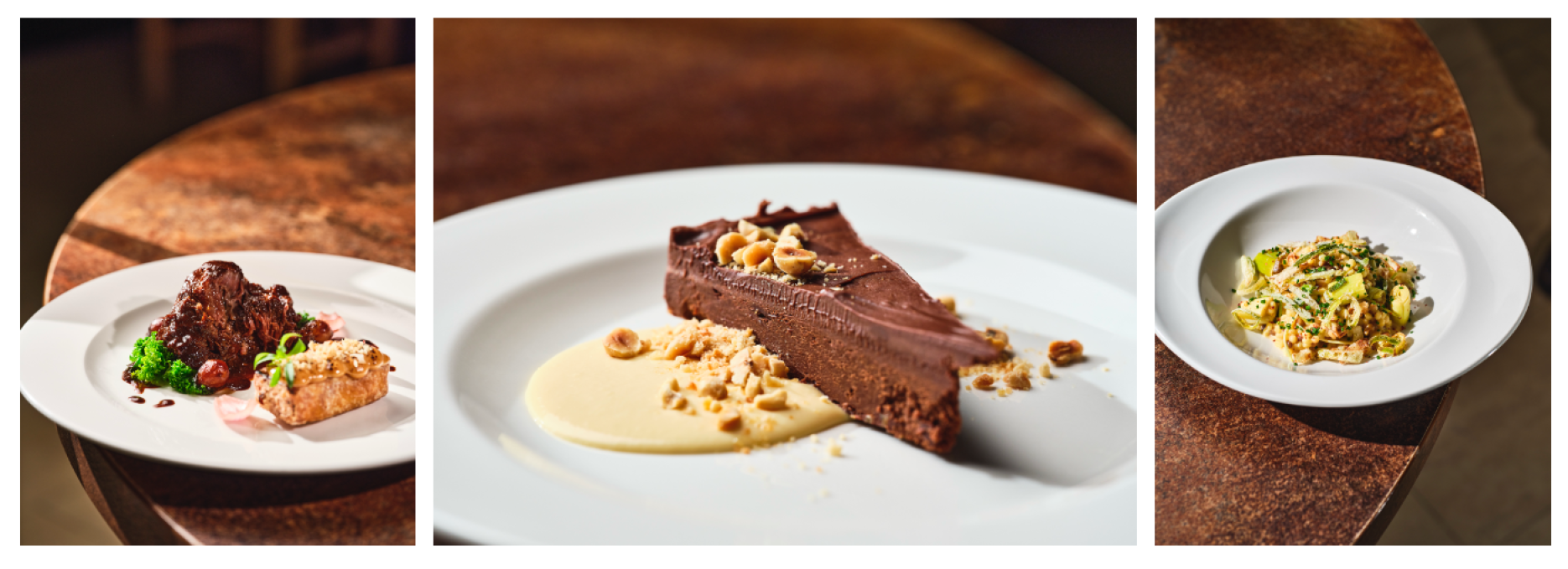 Mains include Szechuan duck breast, Braised ox cheek with polenta crisp, Pan‑seared skate wing with mussels, and a vegetarian Roasted leek Alfredo with fregola and confit garlic. Seasonal desserts such as Poached pear & ginger pudding or Bitter chocolate torte round off a comforting winter lunch.
